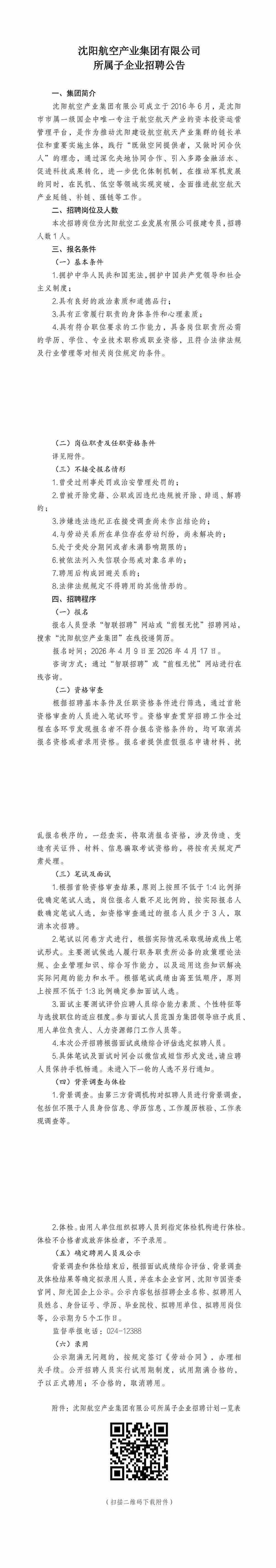 沈陽航空產(chǎn)業(yè)集團(tuán)有限公司所屬子企業(yè)招聘公告